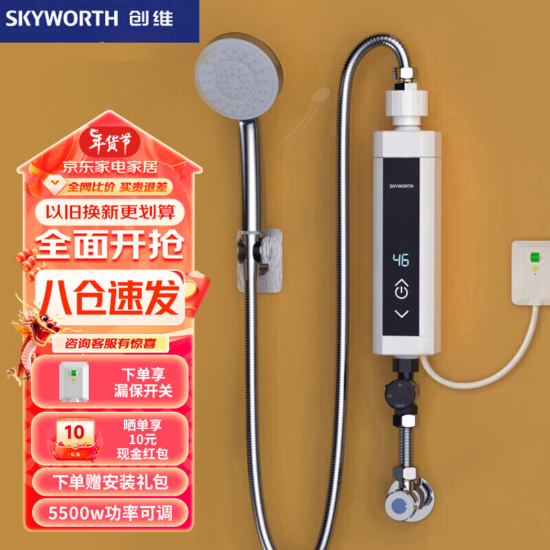 创维(Skyworth)即热式电热水器 速热式家用小型恒温淋浴免打孔变频恒温加热宝D842白5500w沐浴款+送空开+水电分离价格:359.00元!