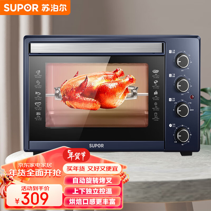 苏泊尔(SUPOR) 家用大容量35L电烤箱 带旋转烤叉 上下独立温控易操作多功能专业烘焙 多层烤位 K35FK609价格:339.00元!