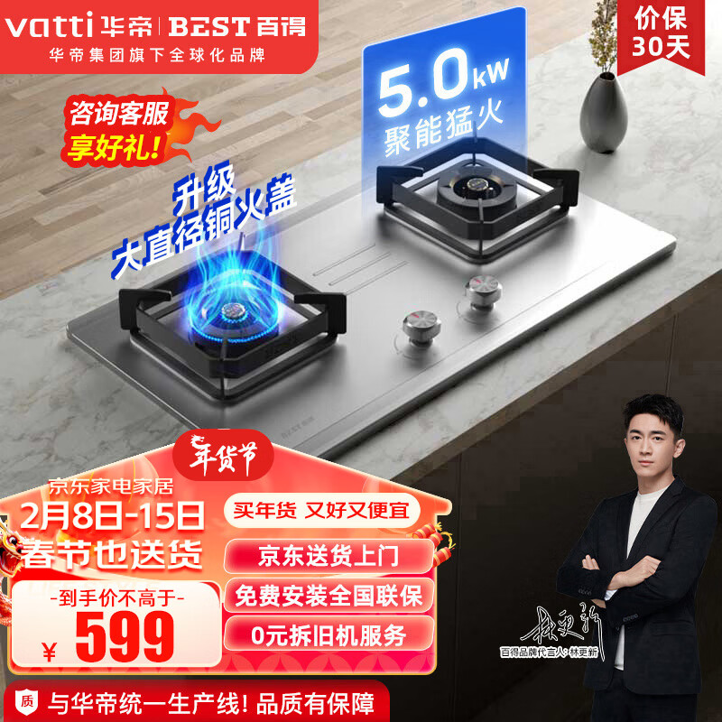 百得(BEST)华帝出品 煤气灶燃气灶天然气液化气双灶炉具 5.0KW家用不锈钢面板猛火台嵌入两用式灶JZY-QE52G价格:699.00元!
