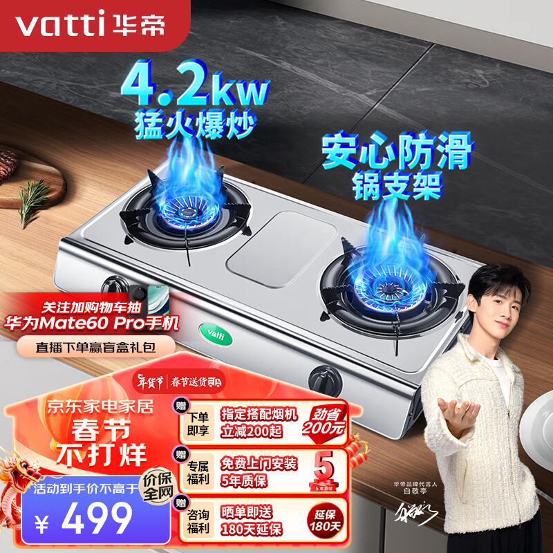 华帝(VATTI)燃气灶家用台式 4.2kW易打理熄火保护不锈钢面板煤气灶双灶台灶具 JZY-i10035A(液化气)价格:499.00元!