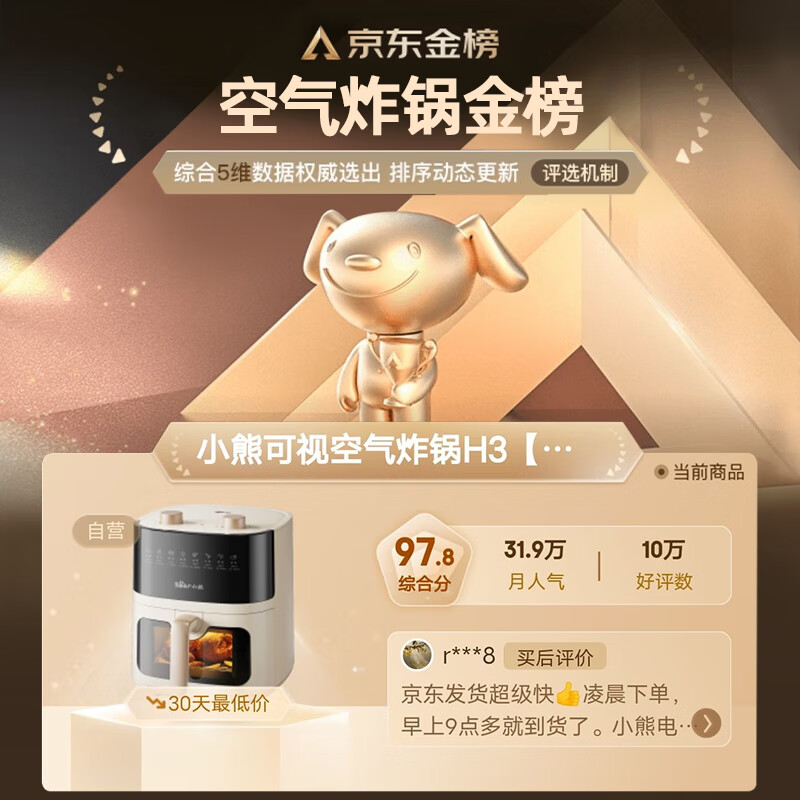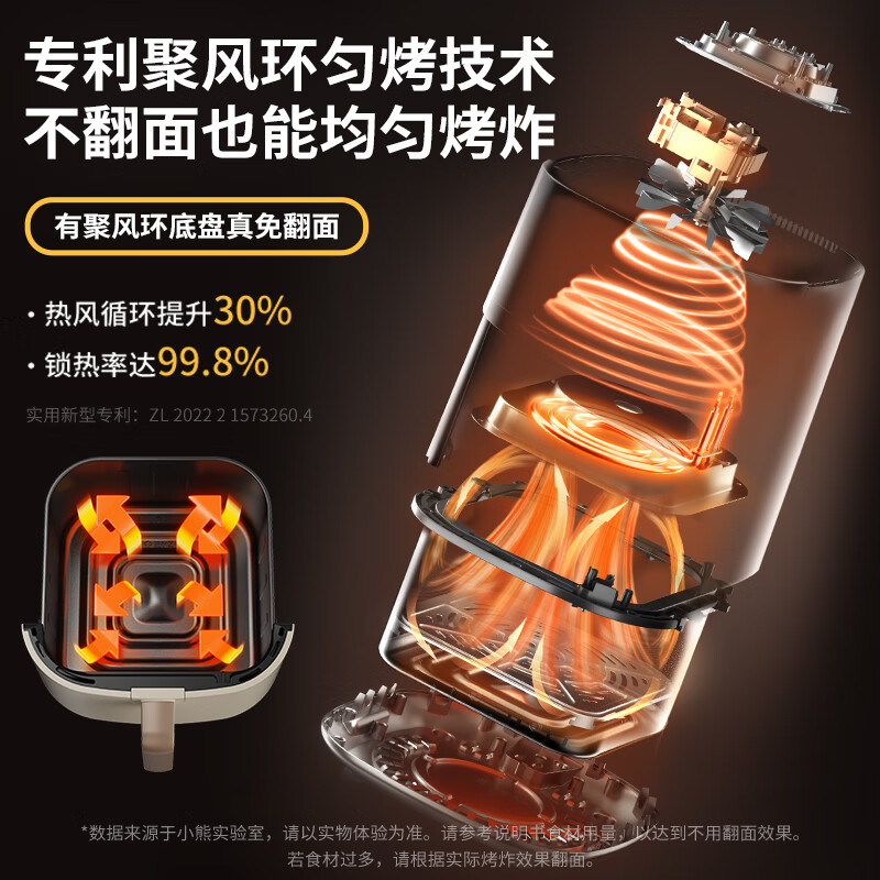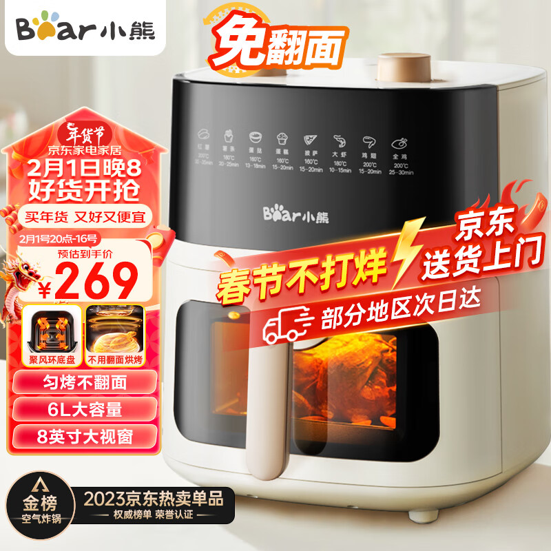 小熊(Bear)空气炸锅大容量6升可视全自动不用翻面家用排行榜多功能低脂微蒸汽嫩烤双旋钮操控 QZG-E16H3价格:269.00元!
