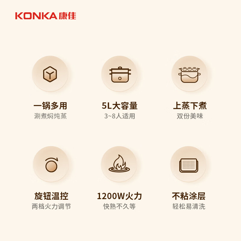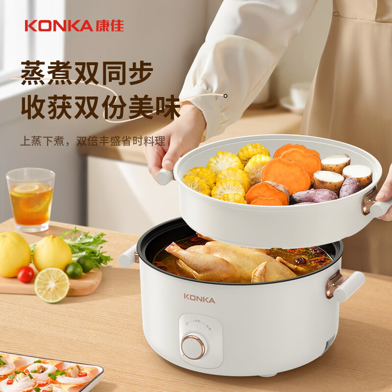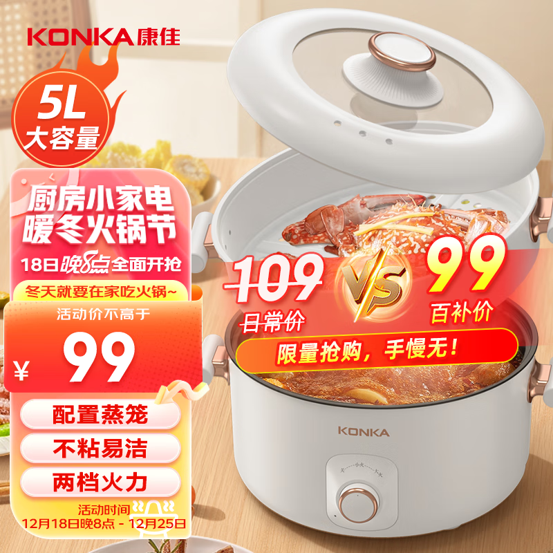 康佳(KONKA)电火锅 多用锅 家用多功能电热锅不粘锅宿舍电煮锅料理锅5L大容量 煮面锅 KDZG-5077-W价格:99.00元!