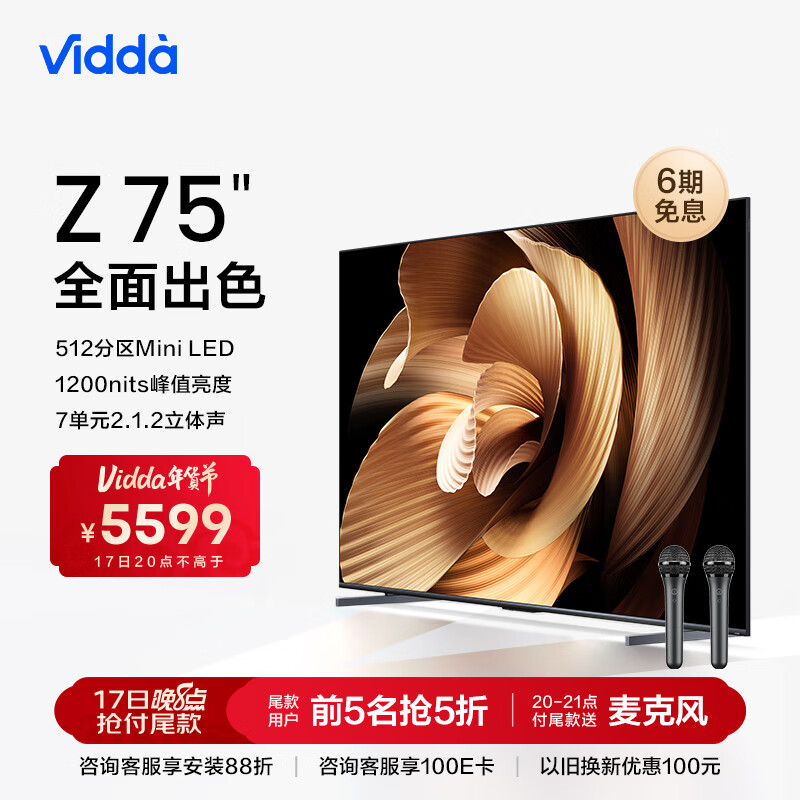 Vidda Z75 海信 75英寸 4+64G 512分区 Mini LED 240Hz 游戏智能液晶电视以旧换新75V7K价格:5599.00元!
