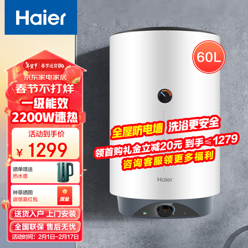 海尔(Haier)竖立式热水器 家用储水式电热水器 高效速热一级能效节能省电厨房洗澡即热式热水器ES60V-V1[家电]价格:1299.00元!