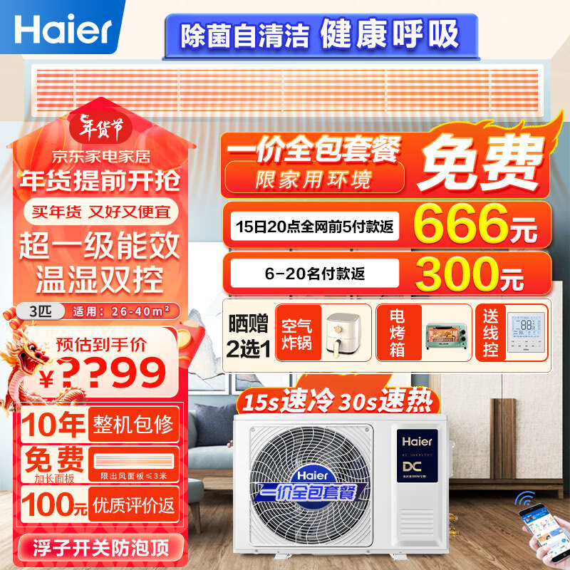 海尔(Haier)中央空调风管机一拖一 家用客厅3匹嵌入式空调3p云舒变频冷暖新一级能效 KFRd-72NW/72ECD81价格:7299.00元!