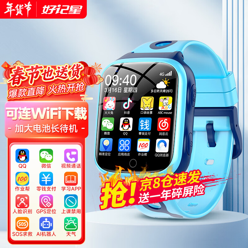 好记星【无游戏】智能儿童电话手表插卡4G卡通用学生移动电信版防摔游泳级防水wifi精准节日礼物 顶配版蓝+加大电池+QQ微信+GPS+WIFI下载价格:309.00元!