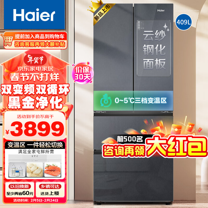 海尔409升法式多门家用冰箱 一级能效双变频风冷无霜黑金净味四开门电冰箱价格:3899.00元!