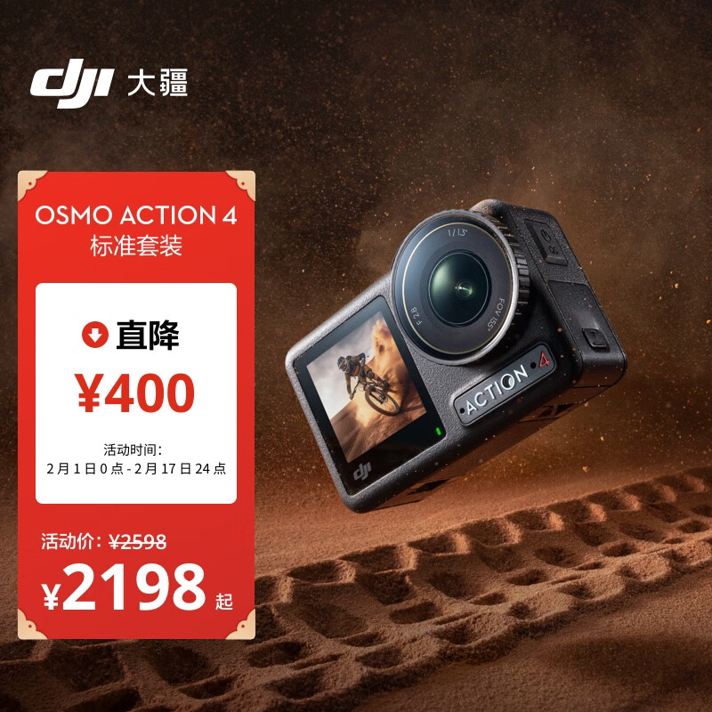 大疆 DJI Osmo Action 4 标准套装 灵眸运动相机摩托车山地公路骑行潜水防抖户外vlog相机+随心换1年版价格:2347.00元!