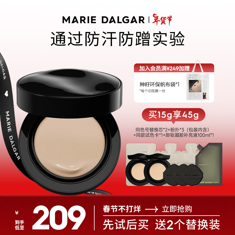 玛丽黛佳(MARIE DALGAR)种籽气垫贴肤锁妆持妆干皮柔光肌滋润粉底气垫C01桃氲价格:209.00元!